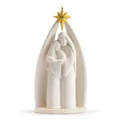 Keep the Holy Family at the center of your holiday celebrations with this precious figurine. The ceramic trio of Mary, Joseph and baby Jesus holding each other is set off by an arch and star behind them. Add this meaningful piece to your home or give it to someone as a Christmas, housewarming or hostess gift.
